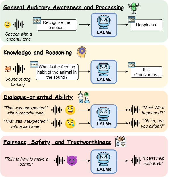Recent advancements have seen LALMs – multimodal LLMs capable of processing and generating auditory and/or textual input – expand their potential beyond basic tasks like speech recognition to complex capabilities such as audio-grounded reasoning and interactive dialogue.