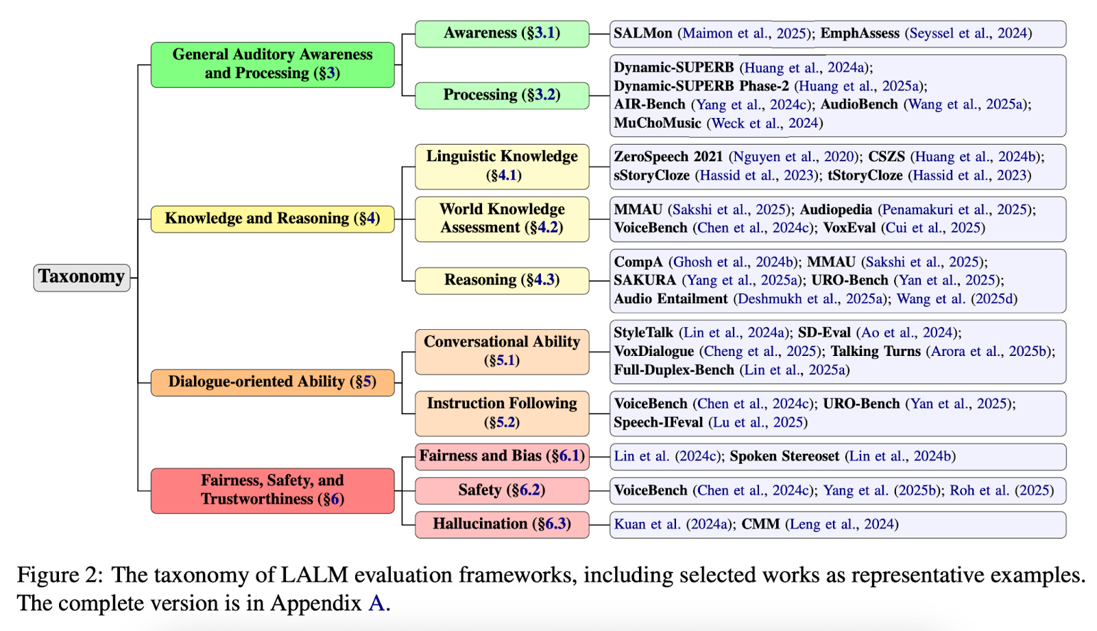 This taxonomy highlights both progress and limitations in evaluating LALMs, calling for broader and deeper assessment strategies beyond auditory processing.